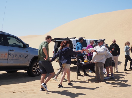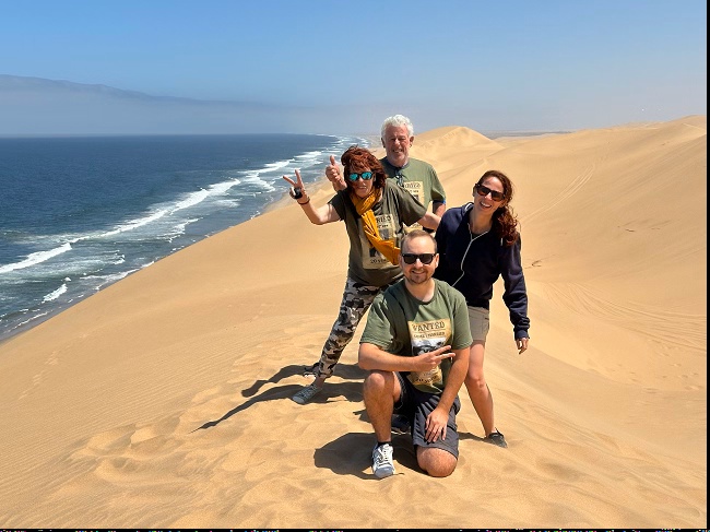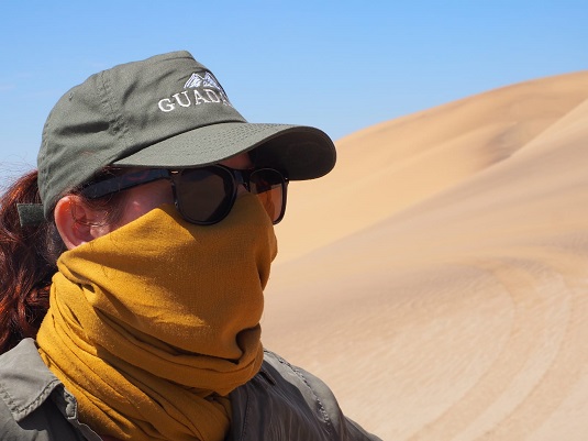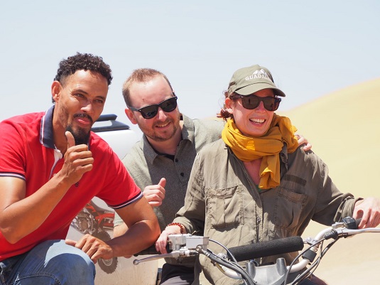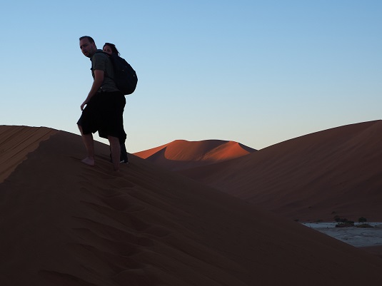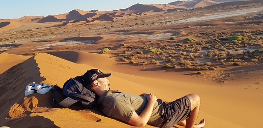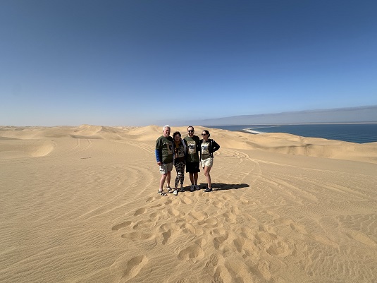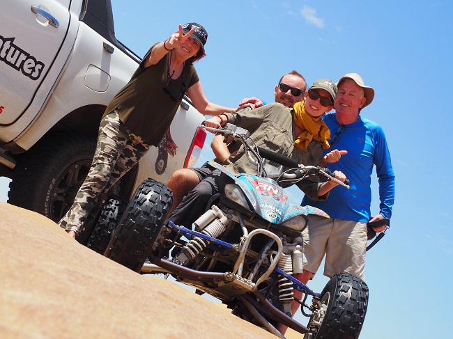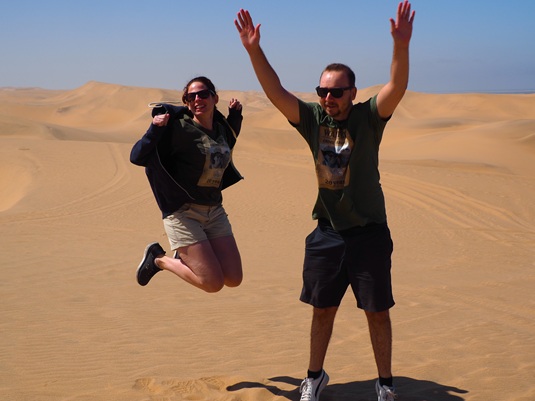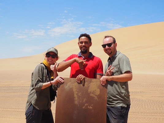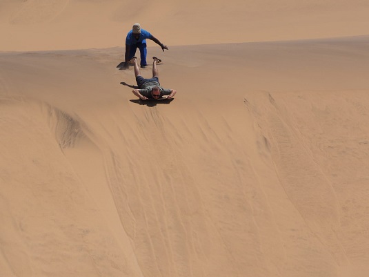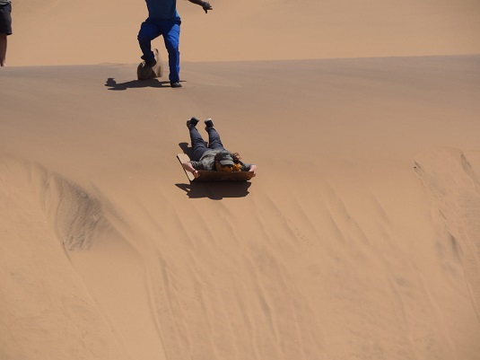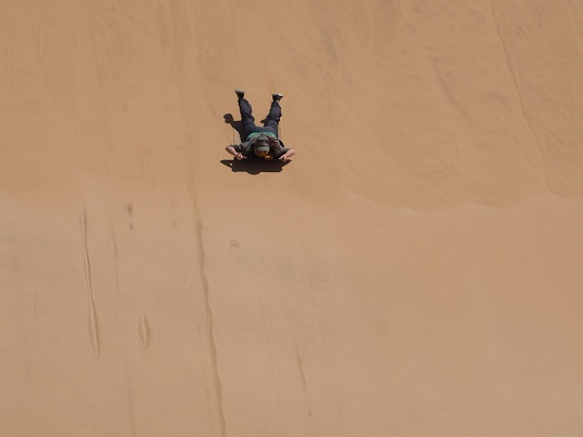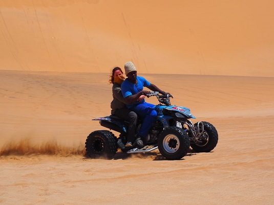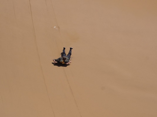 Nous quittons Swakopmund et prenons la B2 puis la C14 en direction de la Dune 7. Car avant de se rendre à Sesriem passage par la Dune 7 qui est réputée pour les activités de glisse. À l’origine, Angy et Luka devaient pratiquer le sandboard ici même. Mais l’établissement avec lequel ils avaient réservé ne propose plus l’activité sur la dune 7 (deux accidents mortels ont conduit à déplacer le site plus loin, sur une dune moins dangereuse). Sur place, une autre option s’offre à eux. Moyennant environ 25 € pour 10 descentes, un quad vous monte au sommet de la dune. Ensuite, allongé sur le ventre sur une planche souple façon luge, on se lance dans la descente. Le sable file sous les yeux, la vitesse augmente, le vent siffle… sensations garanties !