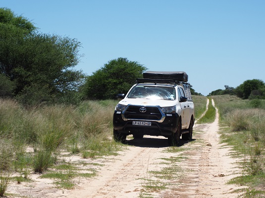 Le lendemain, départ à 7h30. Nous prenons la A20 à la sortie de Sekoma, puis parcourons environ 75 kilomètres avant d’emprunter la piste de sable sur la droite. Dès le début de la piste, nous nous arrêtons pour dégonfler les pneus à 1,8. Cette piste mène à la gate de Mabuasehube, côté botswanais du parc transfrontalier de Kgalagadi, qu’il partage avec l’Afrique du Sud. Dès que nous quittons l’asphalte, l’ambiance change immédiatement. Le bruit des pneus sur le sable, la poussière qui s’élève derrière nous, et cette sensation familière d’entrer dans un autre monde : celui où le temps ralentit et où l’aventure commence vraiment. Mais cette année, quelle surprise ! Le Kalahari s’est mis au vert : il a déjà beaucoup plu. Et pourtant, coup de chance ou bénédiction des dieux du bush, pas une seule goutte de pluie ne viendra troubler notre séjour. Un Kalahari luxuriant, des pistes bien sèches… la version carte postale, sans l’option douche intégrée.