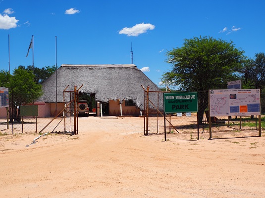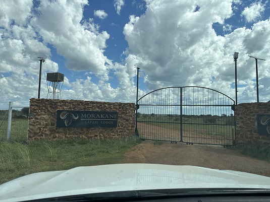 Devant le portail du Morakane Safari Lodge, il nous reste encore 1,5 km de piste à parcourir avant d’atteindre le lodge.