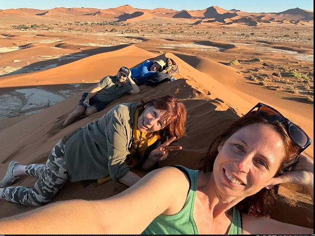 Angy et Luka s’en donnent à cœur joie. Cris, éclats de rire, sable dans les cheveux… ils remontent à chaque fois avec le sourire. Et nous ? JP l’avait déjà fait en 2017. Cette fois, il préfère immortaliser les exploits des jeunes, appareil photo en main, ravi de capturer les descentes à pleine vitesse. Quant à moi… en 2017, trois mois avant notre voyage, je m’étais fracturé le sacrum. Autant dire que la glisse sur dune était totalement exclue à l’époque. Mon sacrum était en convalescence, et moi en mode prudence maximale.