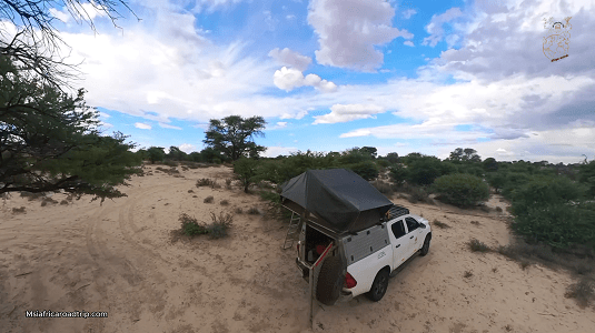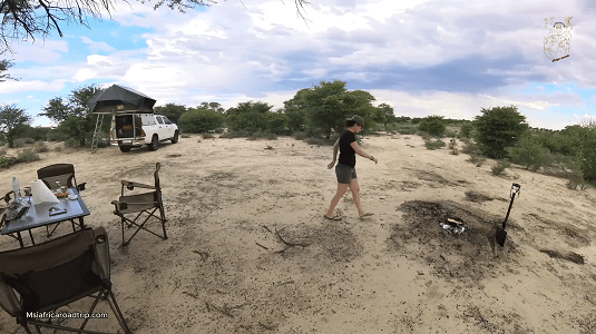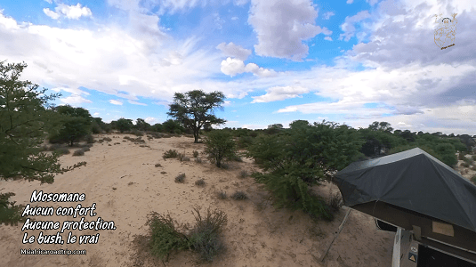 La nuit a été courte. Les voitures se sont mises en alarme à plusieurs reprises. La solution ? Ne pas verrouiller les serrures de votre 4x4. Simple, efficace… et nettement plus reposant. Finalement, nous décidons de prendre notre temps : petit-déjeuner tranquille, puis départ vers 10h pour le Wilderness Trail de Mabuasehube à Nossob. Pour cette traversée, il faut une autorisation pour réaliser ce trail, être au minimum deux véhicules et pas plus de cinq (un seul groupe à la fois/jour). Nous la ferons en deux jours, avec une nuit à Mosomane, “un camp” est clairement un abus de langage. Il faut d’abord le trouver, puis le choisir : un point haut, vue sur le pan, avec ou sans arbre… à l’instinct. Aucun panneau, aucune indication, aucune commodité. Le bush, le vrai.