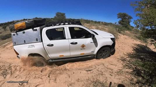 Très vite, la piste nous rappelle où nous sommes. Des zones de sable profond nous obligent à enclencher les quatre roues motrices. Ici, pas question d’hésiter. Le volant bien en main, on joue avec les trajectoires.