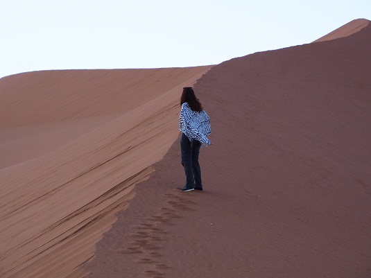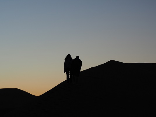 Nous grimpons lentement sur l’une d’elles, le silence du désert est total. Le sable est encore froid sous les pieds. Chaque pas demande un effort, on s’enfonce légèrement, on avance en silence.