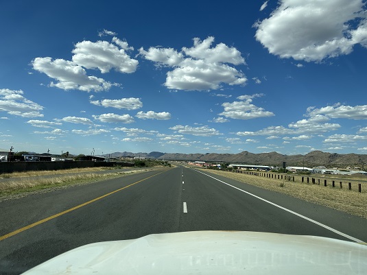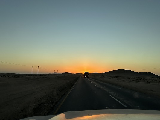À 13h, nouvelle étape : Swakopmund. Nous rejoignons la B1 jusqu’à Windhoek, puis continuons sur la B2 jusqu’à notre destination. Conduite difficile ce jour-là : beaucoup de camions, travaux, fatigue qui s’accumule… mais quelle satisfaction d’avancer.