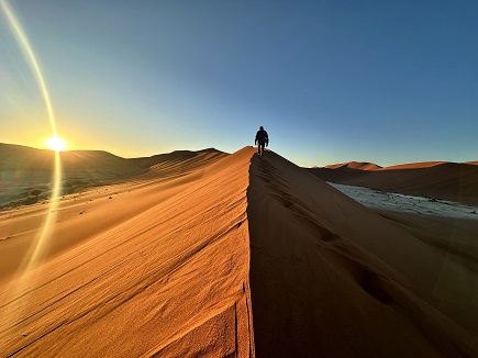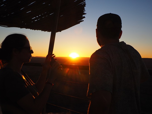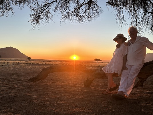 Nous prenons la C27 sur 160 km, et ensuite, nous continuons sur la piste D707 où se trouve le "Namtib Desert Lodge". Nous retrouvons le Namtib Desert Lodge, ce lieu que nous aimons tant depuis 2017. Perdu au pied des montagnes du Tiras, loin de toute pollution lumineuse, il offre un silence et une immensité rares. Ici, le temps semble ralentir. Nous avions choisi cet endroit pour renouveler nos vœux de mariage, vingt ans après le premier “oui”. En fin d’après-midi, la lumière devient magique. Le soleil descend lentement derrière les montagnes, embrasant les roches et les plaines d’une teinte dorée puis cuivrée. Le ciel passe du bleu intense à l’orange flamboyant, avant de se teinter de rose et de violet. C’est dans cette lumière irréelle que notre fille, accompagnée de son compagnon, avait préparé une cérémonie simple et profondément touchante. Elle a immortalisé chaque instant.