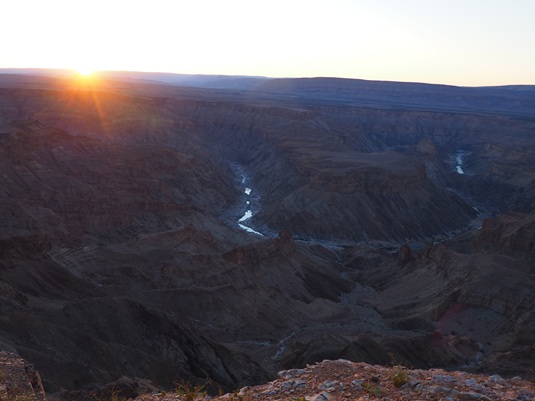 Le spectacle vaut largement le déplacement. Nous savourons un apéritif face à l’immensité du Fish River Canyon, suspendus entre ciel et roche, tandis que la lumière embrase les parois. Retour au camping, encore imprégnés de cette beauté brute.
