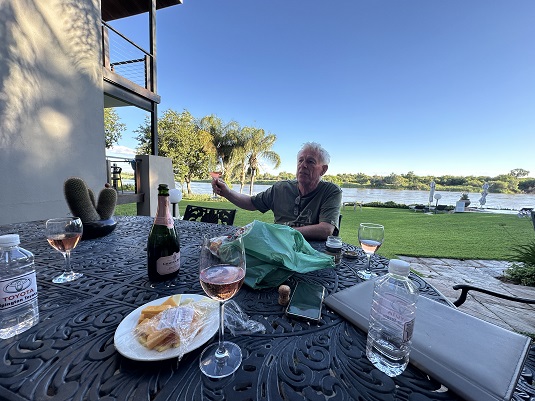 Avant-dernier jour. Nous prenons la direction d’Upington par la B3 jusqu’au poste-frontière de Nakop, où nous arrivons vers 13h. Le temps de faire les formalités, sortie de Namibie, entrée en Afrique du Sud, et trente minutes plus tard, nous roulons déjà sur la N10 côté sud-africain. Nous décidons de faire étape à Upington afin de couper le trajet et profiter pleinement de ce que le parcours nous offre avant de rejoindre Midrand. Upington est située dans la province du Cap-Nord, au bord du fleuve Orange. Ici, l’eau est reine : nombreuses activités nautiques, ambiance paisible, végétation luxuriante contrastant avec les paysages désertiques traversés les jours précédents. Nous arrivons au River Place Manor vers 15h. Un superbe hôtel en bord de fleuve, élégant et chaleureux. Nous y étions déjà venus en 2024… et le plaisir est intact. Vraiment une adresse à découvrir. Franchement, ces derniers jours ont toujours une saveur particulière… un mélange de gratitude et d’envie de repartir déjà. Assis face au fleuve Orange, un verre à la main, on repense aux dunes, aux pistes, aux tempêtes de sable… et à cette liberté immense qui nous a portés pendant deux semaines.