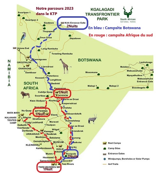 - 🎬Vidéo : Sortie CKGR – Parcours →KTP Botswana – Camping KAA→Nossob AFS