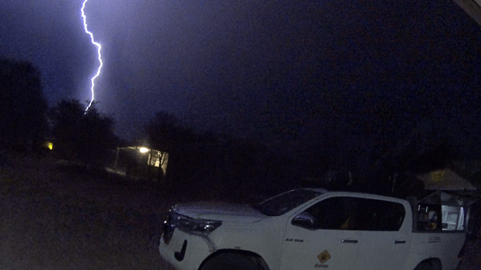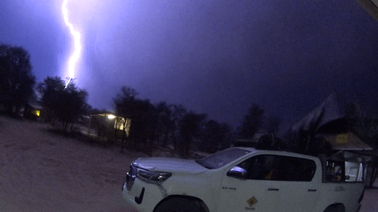 La nuit, elle, fut un vrai spectacle son et lumière. Rafales violentes, pluie battante, éclairs déchaînés, et la voiture qui tangue comme un bateau ivre sous le vent. C’était magnifique cet orage dans le Kalahari !!!