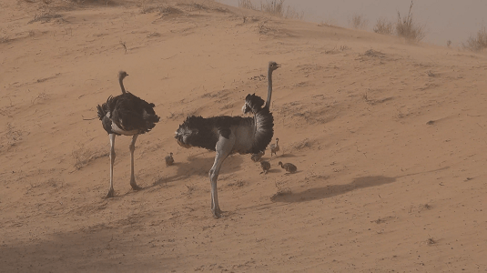 Quelques kilomètres avant d’arriver au camping, la nature décide de nous rappeler qui est vraiment le patron : une tempête se lève, et pas une petite brise sympa, non, un véritable coup de colère venue du désert. Au loin, sur les dunes, une famille d’autruches lutte contre le vent, les autruchons, eux, sont projetés au sol par les bourrasques.