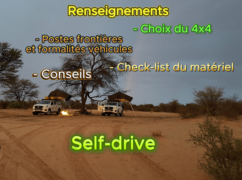 SUV pour les pistes classiques de Nossob à Twee Rivieren et Twee Rivieren à Mata-Mata et d’autres dans le parc côté Afrique du sud. - 4 x4 recommandé → pistes sablonneuses et parfois profondes côté Botswana ou des trails comme : Trail Bitterpan,….
