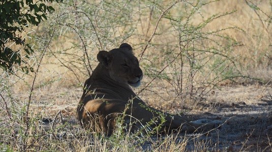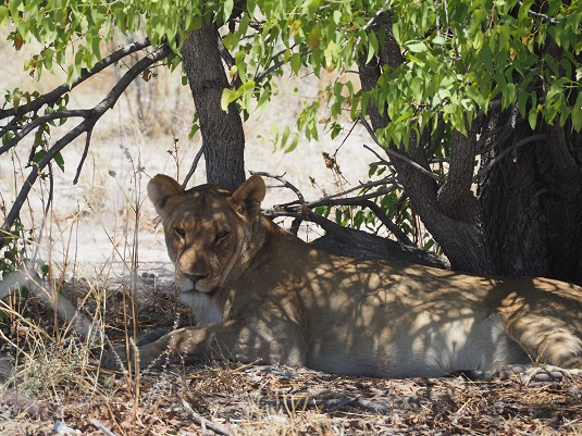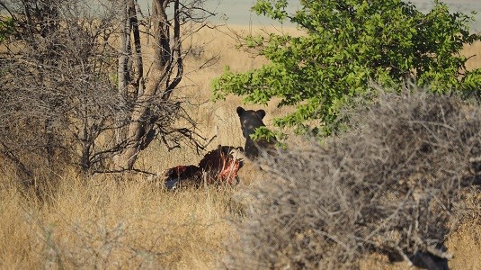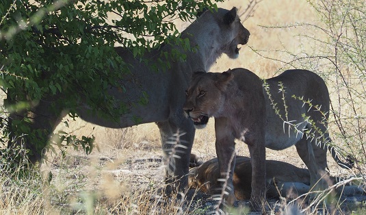 Puis, sous un arbre, sur le chemin menant à Namutoni, il y avait juste en bordure de piste trois magnifiques lionnes. Un peu plus loin dans la savane une autre lionne près d'une grosse carcasse à moitié dévoré, continuait tranquillement son repas.
