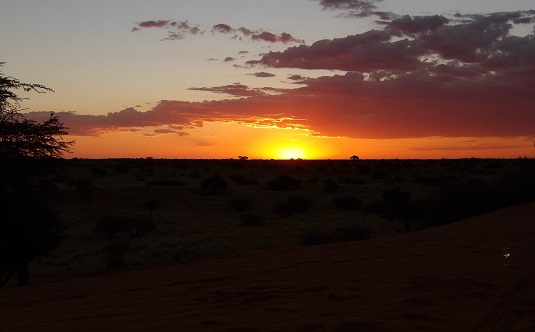 Tout en haut d’une dune dominant un désert de terre rouge, un magnifique coucher de soleil s’offrait à nous.