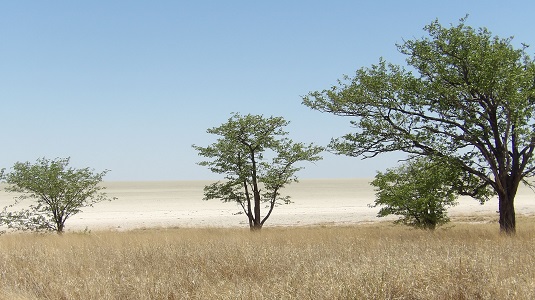Le Parc National d’Etosha est recouvert en grande partie par un lac asséché : Le pan d’Etosha. Un pan salin qui couvre environ 4800 km ² avec 130 km de longueur et 50 km de largeur. 1/3 de la superficie du parc national est ouverte au public.