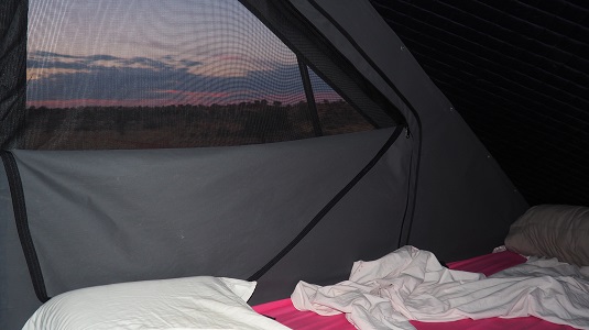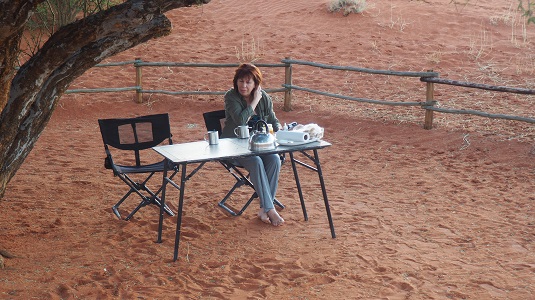 La photo en haut à votre droite : un lever de soleil depuis notre tente. En bas : le petit-déjeuner sous l’arbre.