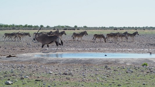 Les campings dans le parc étaient bien, mais les emplacements petits, nous étions un peu les uns sur les autres. Par contre, il y avait d'excellentes installations sanitaires. Sur la photo c'est le camping de Namutoni (2 nuits) il n'y avait pas de place à Okaukuejo. Et 1 nuit à Halali. Photo : Le point d'eau à Halali.