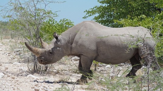 Le rhinocéros noir ou le rhinocéros blanc sont tous les deux gris. Celui-ci, sur la photo est un rhinocéros blanc, il était énorme ! La différence essentielle est leur régime alimentaire : le rhinocéros blanc est herbivore, le rhinocéros noir est phyllophage c'est-à-dire qu'il se nourrit que de feuilles. Soi-disant le le blanc est moins agressif.