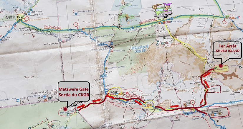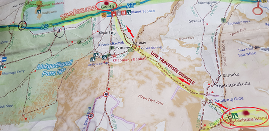 | Matswere Gate (CKGR) → Kubu Island | 181 Km | Environ 5 heures (sans les arrêts) |
