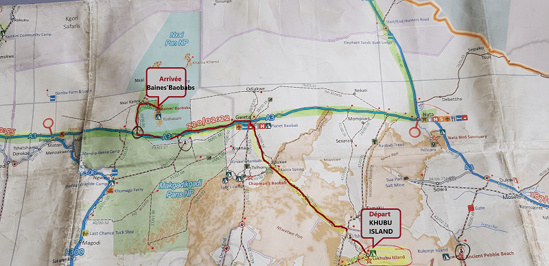 | Kubu Island (Makgadikgadi) → Baines’Baobabs | 204 km | Environ 4 h30 ( sans les arrêts) |