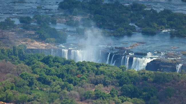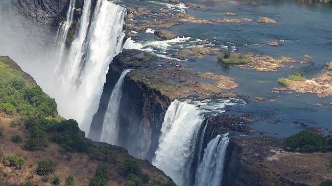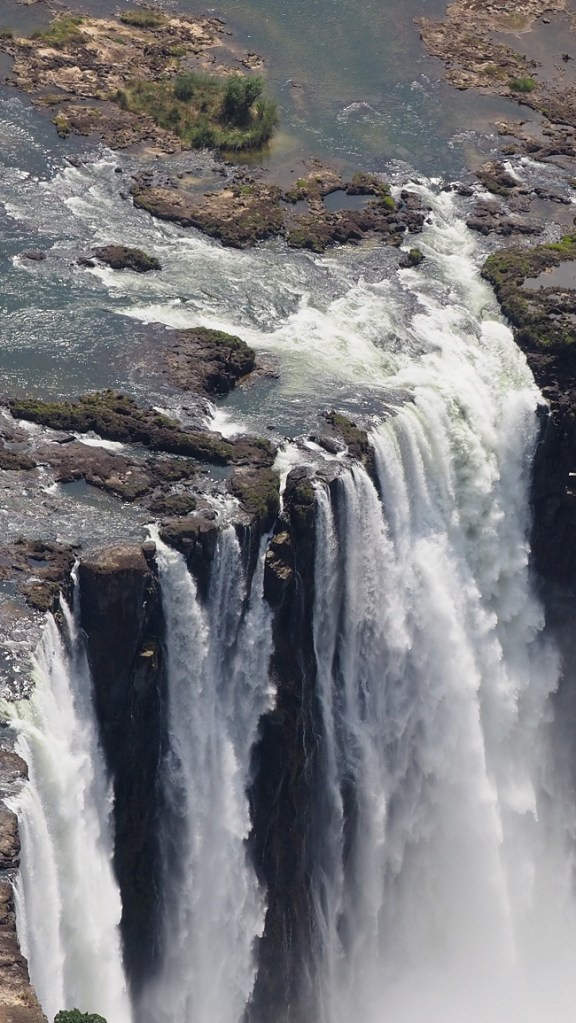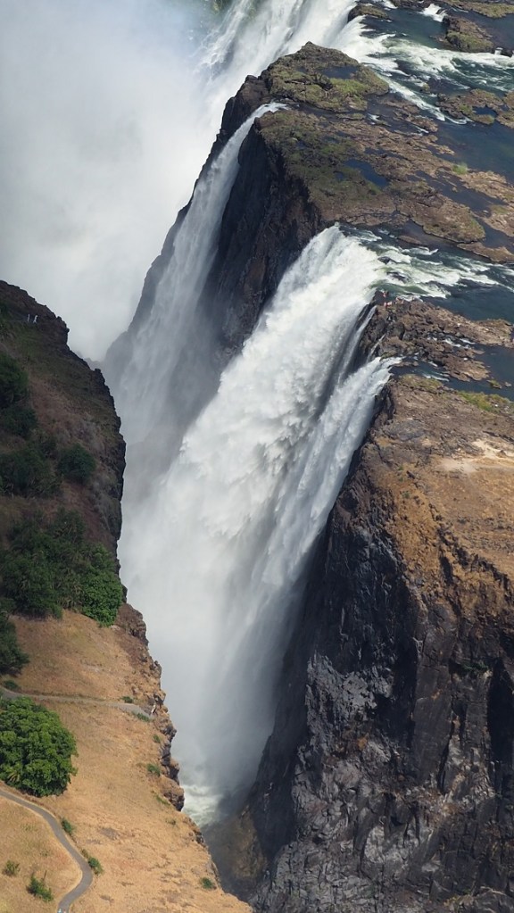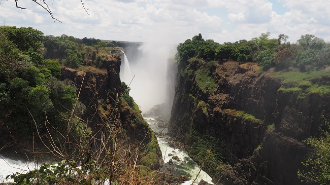 C’est le roi Sekeletu, souverain du peuple Makololo ( Zambie), qui accompagna le 16 novembre 1855 David Livingstone jusqu’à cette merveille naturelle, que l’explorateur baptisa en hommage à sa reine. Les habitants, eux, lui préfèrent le nom de Fumée qui gronde. Les chutes Victoria font partie d’un parc national au Zimbabwe, ainsi qu’en Zambie ( Victoria Falls ou Mosi-oa-Tunya « la fumée qui gronde »). Elles sont situées sur le fleuve Zambèze qui constitue à cet endroit une frontière naturelle entre la Zambie et le Zimbabwe. C’est depuis le ciel qu’on en mesure le mieux la dimension, le fleuve Zambèze se jette dans une longue faille du plateau, pour s’échapper par un étroit canyon, formant ainsi des cataractes sur environ 1,7 km, profonde de 108 mètres, l’eau éclabousse à plus de 300 mètres de haut. Elles ne peuvent ainsi être vues de face que du côté Zimbabwe à seulement une centaine de mètres. Côté Zambie vous pouvez vous baigner dans le Devil’s Pool. Elles font partie des cataractes les plus importantes et les plus spectaculaires de la planète.
