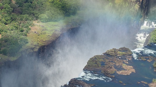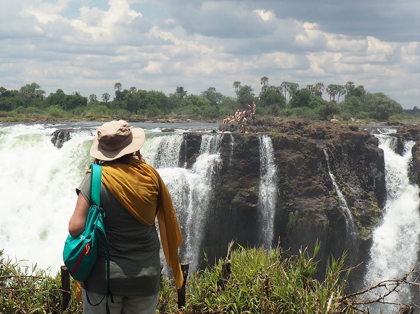 En face c'est la Zambie, les personnes se baignent dans le Devil's Pool (bassin du diable), une piscine naturelle creusée au bord des chutes. Vous avez de nombreuses activités : Rafting, saut à l'élastique,...