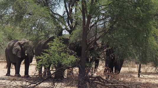 Sur la piste en partant en direction de Maun, nous croisons les éléphants du Kalahari.
