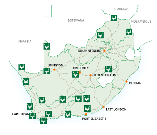 | Addo Elephant National Park Addo Eléphant Main Camp Spekboom Tented Camp Homestead Camping B$B Parc national des Agulhas Agulhas Rest Camp Parc national des chutes d’Augrabies Augrabies Fall Lodge Khamkirri camp Kakamas Hotel Ikaia River Lodge Daberas camp Parc national de Bontebok Swellen2 Farm Lodge Bontebok Caravan and Camping Parc national de Camdeboo Mzomhle Caravan and Camping Camdeloo Tentes Parc national des Golden Gate Highlands Glen Reenen Rest Camp Golden Gate Hotel and Chalets Parc national du Karoo Beaufort West Campsite Ko-Ka Tsara Bush RooiheuwelGuest Farm Campsite Afsaal Cottage Parc transfrontalier de Kgalagadi Molopo Kalahari Lodge Rooiputs camping Mata Mata Urikaruus Twee Rivieren Nossob Polentswa Bitterpan Wilderness | Parc national Kruger Punta Maria Camp Shingewidzi Camp Tsendze Camp Letaba Camp Balule Camp Satara Camp Skukusa Camp Pretoriuskop Camp Lower Sabie Camp Crocodile Bridge Camp Berg En Dal Camp Madelane Camp Parc national de Mapungubwe Mazhou Campsite Leokwe Camp Parc national de Marakele Bontle Campsite Tlopi Tented Camp Hoekberg Campsite Parc national de mokala Motswedi Campsite Lilydale Camp Parc national des zèbres de montagne Mountain Zebra Campsite Parc national de Tankwa Karoo· Perdekloof Campsite Die Mond Campsite Tankwa Skaapwagterspos campsite Skaapsterkertjie Bush Camp | Ai- | Ais / Richtersveld Parc transfrontalier Ai- Ais Hotsprings Campsite De Hoop Campsite Canyon Road Campsite Bo-Plaatz Campsite |