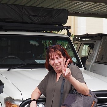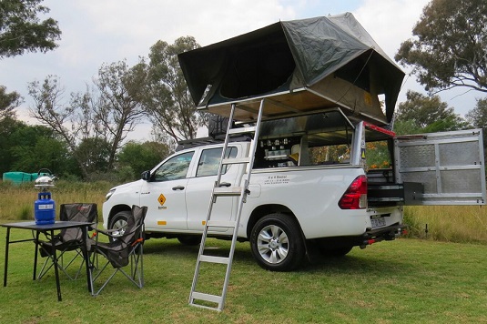 L'un plus basique avec un accès à la tente par l'extérieur par l'échelle, le notre. Et celui de nos amis, qui est beaucoup plus sophistiqué : accès par l'intérieur. Après toutes les vérifications des véhicules, le chargement de nos bagages et les formalités, nous quittons l’entrepôt de Bushlore vers 14h30.